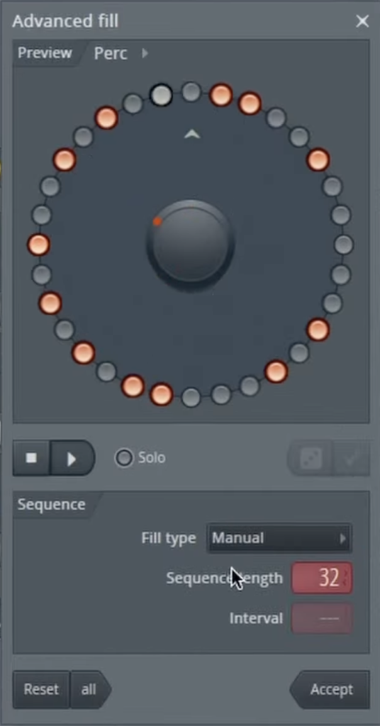 This will open a new window with a circular step sequencer. Here, you can visually design complex rhythms by activating steps on the wheel. You can also adjust parameters like the sequence length and the interval between hits to create everything from simple patterns to complex polyrhythms. It’s a highly creative and visual way to program your drums.