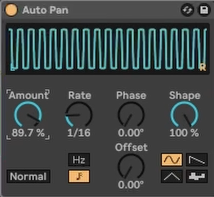 This is the secret to the effect. We are going to use Ableton’s Auto Pan device not for panning, but as a rhythmic volume gate.